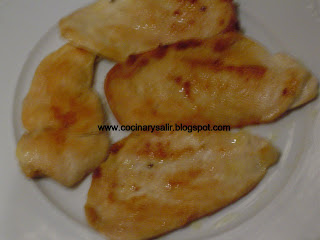 - Calentar el aceite en una sartén y dorar las pechugas de pollo por los dos lados.Retirar y guardar