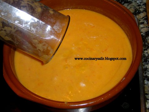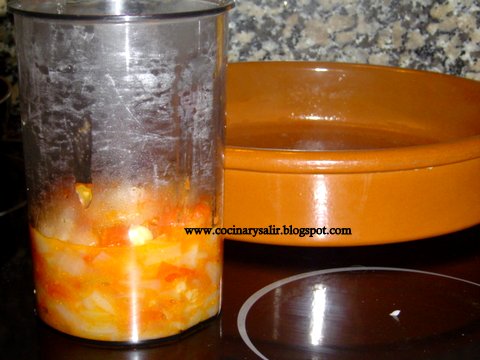 4. cuando está el sofrito acabado pasar a un bote para triturar con la batidora eléctrica con un poco de agua. Sal