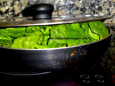 1.  en una sartén introducir las Hojas de Espinacas, bien lavadas y escurridas,  someter a calor y tapar. Sin aceite.