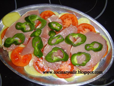 3. en una fuente para horno disponer en capas la cebolla, las patatas, el tomate, los trozos de lomo y el pimiento italiano
